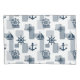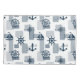 Design marítimo sem costura, com embarcação à vela, bússola, âncora e decoração das rodas de vela em fundo geométrico azul e branco