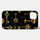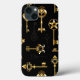 Padrão perfeito de chaves antigas, douradas e silhuetas em fundo preto.