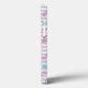 Uma capa de telefone com um padrão com uma vibração de verão divertida. flamingos e abacaxis cor-de-rosa, colocados sobre um padrão listrado azul claro com folhas e corações ao redor.