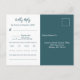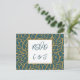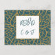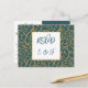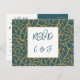O Blue Foliage Pattern Wedding Menu Music RSVP Card completa sua papelaria de casamento. Ele apresenta um padrão de contorno de folhagem dourada Aztek contra um pano de fundo azul da polícia que enquadra o título RSVP e as iniciais do casal. Este cartão-postal de Resposta Rápida com endereço de host faz parte da coleção do Invitation Suite de Foliage Abstrato. O modelo inclui detalhes para os convidados para RSVP até uma data especificada, declara o número de participantes e anota quaisquer requisitos dietéticos. Você também pode adicionar seu título favorito de música de dança. Além disso, personalize todas as cores seguindo o link de edição. Para mais ideias de planejamento de casamento, visite www.KBMD3signs.com. Para obter informações ou assistência personalizadas sobre design, envie um email para info@KBMD3signs.com.
