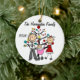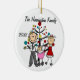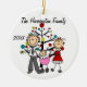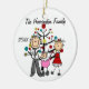 Um ornamento cerâmico redondo bonito do feriado do Natal da lembrança caracteriza uma figura pai, mamã, e bebé da vara em uma carruagem cor-de-rosa na frente da árvore e das áreas decoradas de Natal onde você pode adicionar o texto que inclui o nome do ano em curso e de família. Este é um presente adorável para que toda a família comemore o ano!