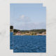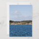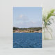 Paisagem da costa sueca com água azul e céu e cascos vermelhos e um barco. Fotografia.