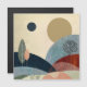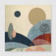 Uma abstrato de paisagem de rolagem de colinas texturizadas com árvores e plantas em cores ousadas de vermelho, laranja, bege, verde e bronzeado.