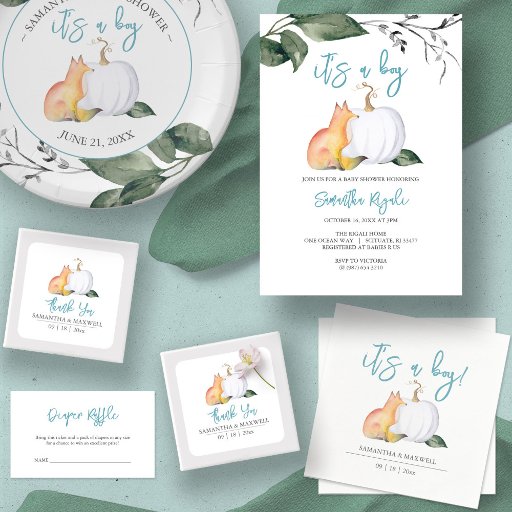 Estes cartões de chá de fraldas contêm "Palavras de Sabedoria definidas em tipografia rosa-tendência. Uma borda superior de raposa aquosa e abóbora branca adiciona um toque de chorona. Use os campos modelo para adicionar texto personalizado. Para ver mais jogos e atividades de chá de fraldas como este, visite www.zazzle.com/dotellabelle