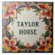 "placa personalizada de nome da casa", "placa personalizada de nome da casa", "placa personalizada de texto", "azulejo cerâmico de flores havaianas", "flor vermelha alaranjada de hawaii", "arte vegetal de hibiscus verde", "natureza das férias botânicas de verão", "sobrenome da última família", "sinalização de casa de férias da ilha", "fronteira decorativa do paraíso tropical"