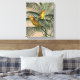 Uma palma elegante hospeda dois bugerigares coloridos num fundo ao estilo hessiano dando à canvas uma sensação tropical e rústica.