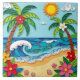 A coastal ceramic tile in a paper quilling style ai illustration of two palm trees, the sun, ocean waves, a beach and tropical flowers.