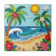 A coastal ceramic tile in a paper quilling style ai illustration of two palm trees, the sun, ocean waves, a beach and tropical flowers.