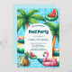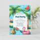 Faça uma piscina inesquecível Convite de Aniversário com este azure - design de azulejo azul-claro do pátio que inclui palmeiras, flamingos agudos, melões e abacaxi.
