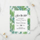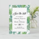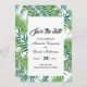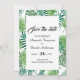 Um elegante verde tropical floral salva a data de um cartão de casamento. Modelos para nomes e data de casamento. Um fundo branco elegante, letras negras. Folhas de palmeiras verdes de cor aquosa e folhagem como quadro. Traseiro: o mesmo plano de fundo que o quadro na frente.
