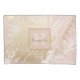 Um modelo de abstrato tropical elegante e moderno. fundo rosa dourado e palmeiras brancas. Decorado com pinceladas de ouro falsas. Na frente: Adicione seu nome e sua letra monográfica. Volta: padrão tropical.