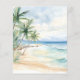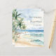 Um convite de casamento elegante para um casamento na praia, casamento de destino. Uma praia arenosa de cor aquática, ondas oceânicas e palmeiras como fundo. 1 folha = 1 convite impresso de borda a borda.