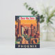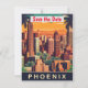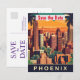 Traga um brilho quente do deserto para o seu casamento com este convite de Phoenix, apresentando uma silhueta urbana retrô ladeada por palmeiras. Esta arte turística clássica de alta qualidade oferece um charme de meados do século perfeito para casais com um senso de desejo de viajar.