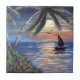Duas palmeiras costeiras e um veleiro no oceano ao pôr do sol com pássaros e flores. Linda paisagem de pintura acrílica de paisagem de uma praia tropical Caribe. Original pintado manualmente por Donna Leger para designs ©irony