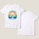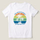 Estas camisas solares de praia tropical legal e personalizada apresentam 3 palmeiras silhuetadas contra um céu laranja e azul acentuadas com amarelo e verde na costa. Personalize para camisetas de manutenção da viagem da família de excelentes para sua fuga costeira nas férias de primavera ou de verão ou cruzeiro oceânico.