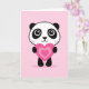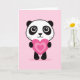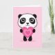 Feliz dia dos namorados cartão com um adorável panda segurando um coração de amor rosa em um fundo rosa. Texto no interior: Feliz dia dos namorados
