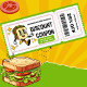 Este cupom de desconto inspirado em vintage apresenta um caractere esquisito de sanduíche de desenho animado e um design de tíquete clássico, lembrando os tíquetes de filme retrô. As cores ousadas e a tipografia divertida fazem dela uma adição divertida e atraente a qualquer campanha de marketing. Adicione um toque de diversão retroativa aos materiais do seu marketing com este cupom de sanduíche vintage.