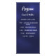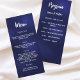 programa de recepção de casamento e cardápio. Personalize e adicione seu nome, seu programa e o cardápio. Fundo azul-marinho, texto branco. A cor azul é irregular.