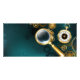 Uma lupa antiga com alça de ouro e lente convexa sobre fundo verde com engrenagens douradas e um relógio antigo. Estilo Steampunk.