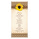 Burlap russo, renda e cardápio de casamento de girassol amarelo-lenha. Este único cardápio de casamento de girassol rústico apresenta um girassol amarelo brilhante, uma burlap and lace look background, e uma madeira e couro parecem emblema sob o girassol. Um bonito design para um verão ou um casamento de outono/outono. Pode funcionar para casamentos rústicos, fazendas, celeiros, ao estilo ocidental ou country. Há muitos detalhes sutis na design. Browns, amarelos, beige são as cores proeminentes.