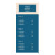 Frente: Este cartão de rack de salão de beleza tem texto de exibição bege para o seu nome e título no topo. Na parte inferior, há texto adicional para a sua lista de preços. Verso: O verso é azul. Na parte inferior, há texto de exibição para as suas informações de contato, como o endereço do salão, número de telefone e site. Qualquer parte do texto pode ser editada ou excluída.