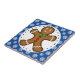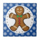 Biscoito de pão-de-gengibre num fundo azul de flocos de neve brancos.