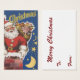 Ilustração vintage de capa de livro de contos de Natal do clássico romance infantil "Era uma Noite antes do Natal". Este design apresenta um jovial Papai Noel descendo a chaminé de uma casa com um saco cheio de brinquedos na véspera de Natal. Estrelas amarelas cintilantes estão no céu azul brilhante. Feliz Natal a todos e a todos uma boa noite! Boas Festas!