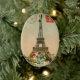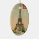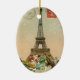 Uma imagem bonita do vintage da torre Eiffel em Paris de um cartão velho com selo e carimbos postais é juntada pelo papai noel de um vintage do excelente com um cheio do carro dos brinquedos e das crianças que constroem um boneco de neve pela base da torre Eiffel nestes enfeites de natal temáticos franceses bonitos e nostálgicos. O reverso diz "Joyeux Noel", Feliz Natal em francês, mas considera-o personalizar com nomes e ou datas para um ornamento personalizado. Este design está igualmente disponível como um cartão e um selo de Natal.