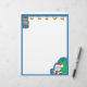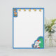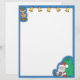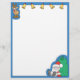 Esta cartoon letterhead apresenta uma rena e cinco sinos de ouro no topo, Papai Noel sentado com um grande saco de brinquedos no canto inferior direito, e uma borda azul.
