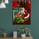 Papai Noel! Papai Noel traz os presentes para você! Um Papai Noel fofo com um saco presente e muitos presentes em uma sala de estar!