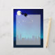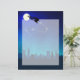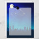 Ilustração de papais noeis Sleigh: Uma carona na noite sobre o horizonte de uma cidade com o céu noturno e a lua brilhante e estrelas ao fundo.