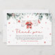 Os Papais noeis Vermelhos Bebê de inverno Bebê de Natal O Cartões de agradecimentos de roupa é uma maneira deliciosa de expressar gratidão aos seus convidados depois de um chá de fraldas festivo. Apresentando um charmoso design vermelho e verde com verde de inverno e roupas adoráveis de bebê penduradas em uma faixa de roupas, este cartão captura perfeitamente o calor e a alegria da temporada de festas. É um toque atencioso e sazonal que aumenta a entusiasmo de acolher seu pequeno. Perfeito por agradecer aos entes queridos pela sua presença e presentes durante o seu chá de fraldas de inverno!