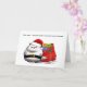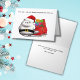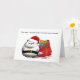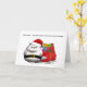 Cartão de Natal bobo com um gato com má atitude, vestindo um chapéu de Papai Noel e parado na frente de um saco de presentes. A mensagem de dentro atualmente diz: "Eu não faço carvão, mas você deixou algo na caixa de lixo." Atualizar facilmente todo o texto.