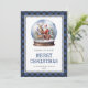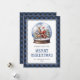 Cartão de Natal de xadrez azul personalizado de búfalo com o Pai Natal e a rena. Personalize facilmente este cartão azul de Natal de cor aquosa com o nome da sua família e o ano.
