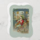 Aí vêm Papais noeis! Ele está dirigindo sua incrível máquina voadora através do céu noturno. Estrelas, galerias e decorações de ricos no avião e sua carga de brinquedos maravilhosos para a manhã de Natal. A imagem restaurada de um cartão postal vitoriano apresenta um fundo gelado, sotaques dourados e cores lindas e brilhantes. É enquadrado em artigos e ornamentos com uma vila de Natal ao fundo.