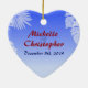 Papais noeis de Natal personalizados, Enfeites de natal de Amor de Casamento Flamingo Beach. Com dois flamingos, um vestindo um chapéu de Papai Noel em tons de rosa, azul, branco e vermelho. Pode ser personalizado com o nome e a data do casal.
