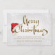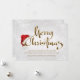 Cartão de Natal corporativo com dourado Escrito de Natal Feliz e chapéu de Papai Noel vermelho num lindo fundo prateado com floco de neve branco. Este cartão de Natal corporativo floco de neve é facilmente personalizado simplesmente adicionando sua mensagem e logotipo no estilo de fonte e na cor de sua escolha.