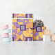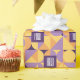 Com padrões geométricos em tons suaves de roxo, laranja e amarelo, este design traz um toque sofisticado e nostálgico para o seu dia especial.