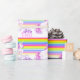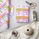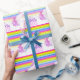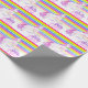 Papel de embrulho de segundo aniversário com estrias de arco-íris de cor d'água da Unicórn. Personalize com seu próprio nome, lê Feliz Aniversário Stella Dois. Pintura de unicórnio balnear branca e design por Sarah Trett www.sarahtrett.com para www.mylittleeden.com no zazzle.