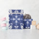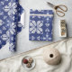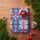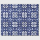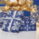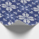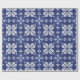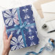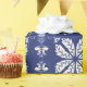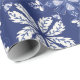Uma folha de papel de embrulho azul escuro com um padrão de borboleta branca. A imagem superior mostra o papel parcialmente desenrolado; a inferior exibe-o plano.