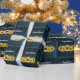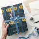 Envolva presentes para os noivos com um rolo de papel de embrulho de casamento com girassóis em azul rústico. O design do papel de embrulho apresenta um fundo de madeira rústica com um buquê elegante de girassóis. Papelaria de casamento adicional e presentes disponíveis com este design também.