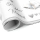 O deslumbrante papel de embrulho de casamento Corações e sinos prateados apresenta a imagem de sinos de casamento prateados e fitas com corações prateados em um fundo branco. O texto personalizável lê "No seu casamento" e é exibido em uma fonte prateada elegante. Uma borda prateada e branca é apresentada nas bordas do design.