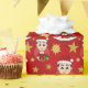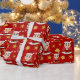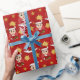 Papel de embrulho de Natal com uma ilustração de um menino feliz sorridente de cabelos negros, ele está vestindo fantasia vermelha e branca de Papai Noel e segurando um presente; com um modelo de texto editável para seu nome ou mensagem, design de feriados de Natal com um fundo vermelho sem soldadura com estrelas