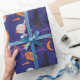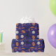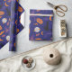 O "Halloween Wrapping Paper: Witch, Broom and Moon" captura bruxas que passam por luas brilhantes e nuvens de areia, com palavras ousadas de Halloween como "boo", ideal para embrulhar presentes assustadores.