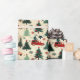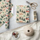 Este papel colorido de embrulho apresenta um design de feriado, mostrando árvores verdes, carros vintage e flocos de neve alegres contra um fundo creme, perfeito para dar presentes.