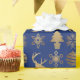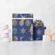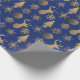 Papel de enrolamento mostrado em uma adorável cor dourada e impressão azul real de árvores de Natal, cabeças de renas e flocos de neve. Cor Real/tom dourado. Personalize este item ou comprar como está.