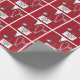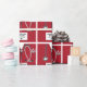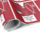 Papel de embrulho de presente criativo para graduados em medicina, apresentando scrub hospitalar vermelho exclusivo, estetoscópio e caneta suíça engraçada. Edite o texto para adicionar o nome do médico.