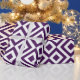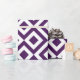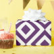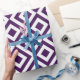 O papel de envolvimento à moda caracteriza um teste padrão roxo e branco corajoso, geométrico, régio. Os diamantes roxos com beiras brancas são cercados pelos meandro do roxo real que dobram em torno deles. Os ziguezagues brancos separam os trajetos do enrolamento e os diamantes roxos do offset.