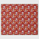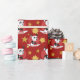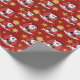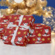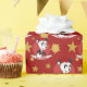 Papel de embrulho de Natal com ilustração de um cabeça de panda fofo com chapéu de Papai noel, em círculo vermelho, com estrelas amarelas, design de Natal para crianças, com texto personalizável modelo de nome ou mensagem; ilustrado por Radka Kavalcova