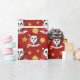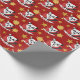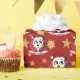 Papel de embrulho de Natal design personalizado com ilustração de um cabeça de panda fofo com chapéu de Papai noel, em círculo vermelho, com estrelas amarelas, design de Natal para crianças, com modelo de texto personalizável para o seu nome ou mensagem; ilustrado por Radka Kavalcova